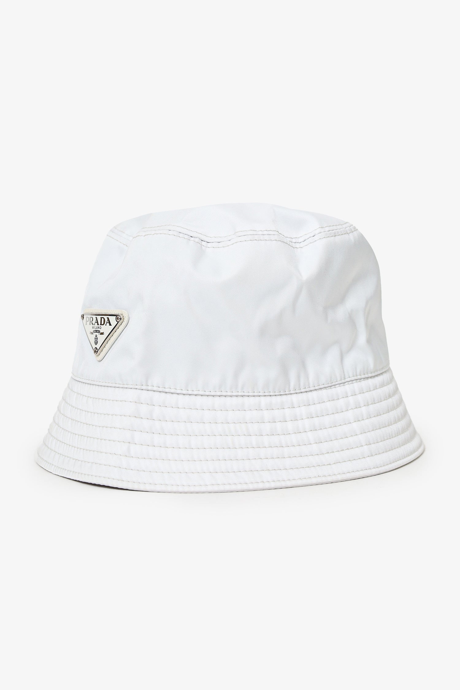 Prada White Nylon Bucket Hat. Logo embellishment at front. Lined interior. Silver-tone hardware. Tonal stitching.